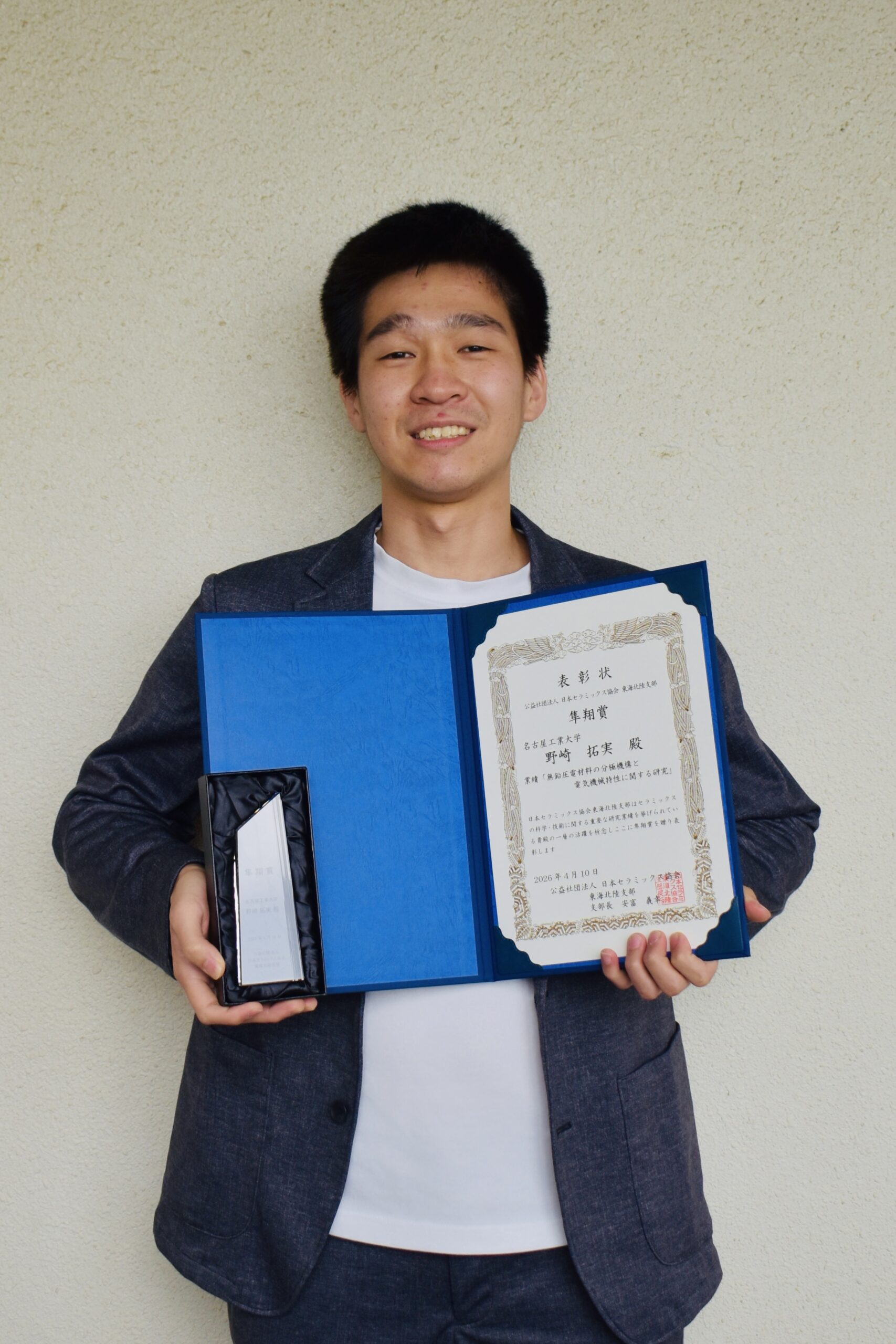 | 2023.04.14 | 山本凌大 大学院生が日本セラミックス協会東海支部表彰「隼翔賞」を受賞しました。 受賞題目は「有機無機コンポジットの振動発電および有限要素解析に関する研究」です。Photo1📷 |